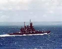 While patrolling off the island in the early hours of 1 February, Indiana cut in front of Washington to go refuel a group of destroyers, causing the latter to ram the former and significantly damaging both ships. Indiana had some 200 ft (61 m) of plating torn from her hull, and Washington's bow collapsed.[29] The two vessels withdrew to Majuro for temporary repairs; Washington's crumpled bow was reinforced to allow her to steam to Pearl Harbor on 11 February for further temporary repairs. After arriving there, she was fitted with a temporary bow before continuing on to the Puget Sound Navy Yard in Bremerton, Washington, for permanent repairs.[7] Another new set of screws was installed and in April, Washington conducted vibration tests that revealed a partial solution: the ship could now steam at high speed without significant issues, but vibration was still excessive at speeds between 17 and 20 knots (31 and 37 km/h; 20 and 23 mph).[4] Once the work was completed, the ship joined BatDiv 4 and took on a group of 500 passengers before departing for Pearl Harbor. She arrived there on 13 May and disembarked the passengers and proceeding back to the fleet at Majuro. On arrival on 7 June, she resumed her service as now-Vice Admiral Lee's flagship.[7]