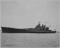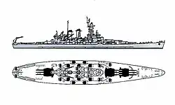 The ship was armed with a main battery of nine 16 in /45 caliber Mark 6 guns[a] guns in three triple-gun turrets on the centerline, two of which were placed in a superfiring pair forward, with the third aft. The secondary battery consisted of twenty 5 in (127 mm) /38 caliber dual purpose guns mounted in twin turrets clustered amidships, five turrets on either side. As designed, the ship was equipped with an anti-aircraft battery of sixteen 1.1 in (28 mm) guns and eighteen .50-caliber (12.7 mm) M2 Browning machine guns,[b] but her anti-aircraft battery was expanded greatly during her career.[2][3]