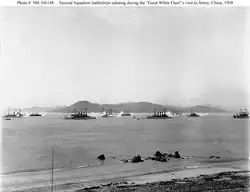 The ship then steamed back down to San Francisco in early July. There, she joined the Great White Fleet, which had departed Hampton Roads, Virginia, the previous year on the first leg of its global cruise.[3] The cruise of the Great White Fleet was conceived as a way to demonstrate American military power, particularly to Japan. Tensions had begun to rise between the United States and Japan after the latter's victory in the Russo-Japanese War in 1905, particularly over racist opposition to Japanese immigration to the United States. The press in both countries began to call for war, and Roosevelt hoped to use the demonstration of naval might to deter Japanese aggression.[4]