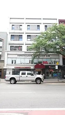 The traditional Ukrainian area in New York City is called Little Ukraine or the Ukrainian East Village,[2] and is located within the East Village in Manhattan. Ukrainian population of Little Ukraine topped around 60,000 residents after World War II, which dwindled subsequently.[3] Today about a third of approximately 80,000 Ukrainian Americans living in New York City are residing in Little Ukraine, which is bounded by Houston Street and 14th Street, and Third Avenue and Avenue A.[4]