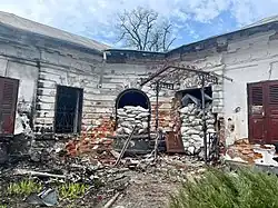 In March 2022, Russian shelling destroyed three wooden churches built in the 19th century: St. George's Church in Zavorychi, the Church of the Nativity of the Theotokos in Viazivka and the Church of the Ascension in Lukianivka.[44][45] These churches were all part of the Moscow Patriarchate.[46][47] The Sviatohirsk Cave Monastery was damaged by airstrikes and shelling several times between 12 March 2022 and early June, when the area was captured by Russia. Several churches of the monastery were destroyed completely and other buildings were damaged.[48] The first bombing also wounded several of the roughly 520 refugees seeking at the monastery.[49]