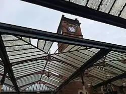 View up at the awnings of platform 1 and the clock tower from Platform 3