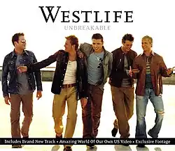 "Unbreakable" is a song performed by Irish boy band Westlife, taken from their first greatest hits album, Unbreakable - The Greatest Hits Volume 1 (2002). It was released on 4 November 2002 by RCA Records and Syco Music as the lead single from the album's. The song was written by Jörgen Elofsson and John Reid, and produced by Steve Mac. It was composed in the traditional verse–chorus form in G major, with the group's vocals ranging from the chords of D4 to C6.[2]