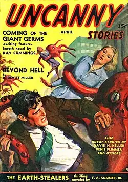 Uncanny Stories was a pulp magazine which published a single issue, dated April 1941. It was published by Abraham and Martin Goodman, who were better known for "weird-menace" pulp magazines that included much more sex in the fiction than was usual in science fiction of that era. The Goodmans published Marvel Science Stories from 1938 to 1941, and Uncanny Stories appeared just as Marvel Science Stories ceased publication, perhaps in order to use up the material in inventory acquired by Marvel Science Stories. The fiction was poor quality; the lead story, Ray Cummings' "Coming of the Giant Germs", has been described as "one of his most appalling stories".