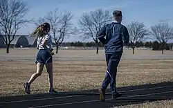 The Air Force Physical Training Gear (PTG), first released on 1 October 2006 as Air Force Physical Training Uniform (AFPTU), consists of shorts, short-sleeve and long-sleeve T-shirts, jackets, and pants. The shorts are AF blue with a silver reflective Air Force logo on the wearer's front left and reflective stripes on the sides. The T-shirts are light grey with moisture-wicking fabric with a reflective Air Force logo on the upper left portion of the chest and the words "AIR FORCE" across the back. The jacket is blue with white piping and a reflective vertical line along the back. The pants are blue with silver reflective stripes on the lower legs. At one point, the jacket and pants were redesigned with a lighter, quieter material that didn't make noise with movement.[14][17]