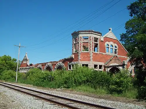 Union Station is the ruin of an historic former train station located at Lockport in Niagara County, New York. It was constructed in 1889, for the New York Central Railroad (NYC) in the Romanesque style. The station served the NYC Falls Road line, an east–west corridor connecting Niagara Falls and Rochester, New York. While technically not a "union station" - as no other railroad shared its facilities - it took its local name from its address on Union Street in Lockport.