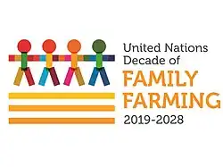 The United Nations declared 2014 the International Year of Family Farming (IYFF).[3] Following the success of IYFF 2014, the United Nations General Assembly proclaimed 2019–2028, the United Nations Decade of Family Farming (UNDFF).[4] The decade was launched on 29 May 2019.[5]