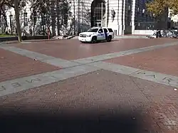 ![]() UN Plaza features the emblem of the United Nations and a view of San Francisco City Hall, looking west (2010) | |