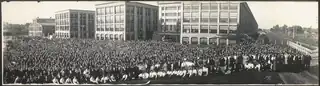 Several thousand corporate employees, the entire workforce gathered at a greenlawn in front of the factory buildings for a group photo, 1911