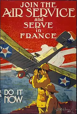 The United States Army Air Service (USAAS)[1] (also known as the "Air Service", "U.S. Air Service" and before its legislative establishment in 1920, the "Air Service, United States Army") was the aerial warfare service component of the United States Army between 1918 and 1926 and a forerunner of the United States Air Force. It was established as an independent but temporary branch of the U.S. War Department during World War I by two executive orders of President Woodrow Wilson: on May 24, 1918, replacing the Aviation Section, Signal Corps as the nation's air force; and March 19, 1919, establishing a military Director of Air Service to control all aviation activities.[2] Its life was extended for another year in July 1919, during which time Congress passed the legislation necessary to make it a permanent establishment. The National Defense Act of 1920 assigned the Air Service the status of "combatant arm of the line" of the United States Army with a major general in command.[3]