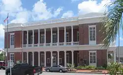 The U.S. Custom House in Galveston is a simply detailed Classical Revival, two-story, brick building located near the waterfront in Galveston. The most notable features are the projecting double gallery on the west facade and the inset double galleries on the longer, north and south facades. The exterior walls are hard-fired, red-brown bricks with tan bricks used as accents around the corners and doorjambs. The prominent location at the southeast corner of Twentieth and Post Office (Avenue E) Streets emphasizes its importance to Galveston's shipping-based economy.