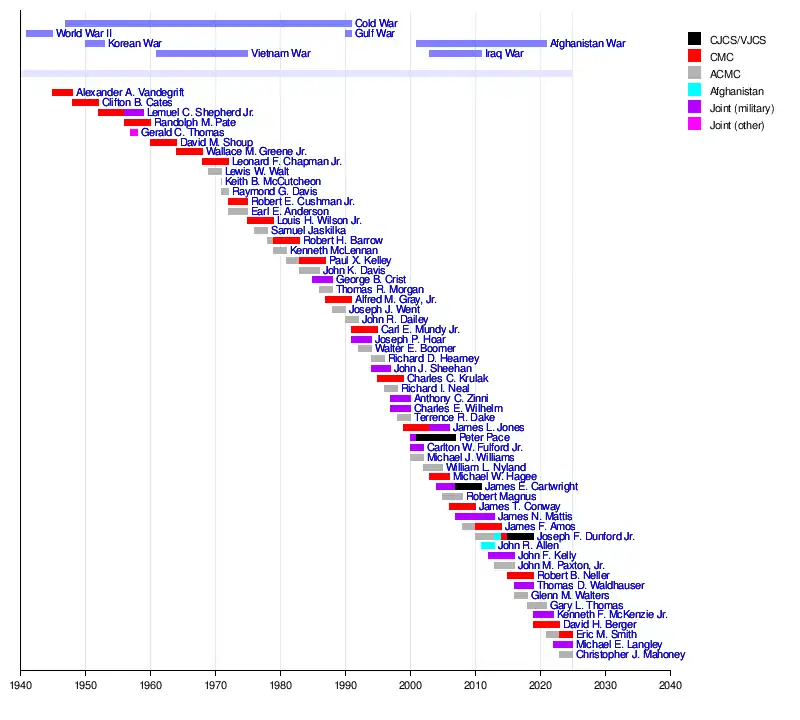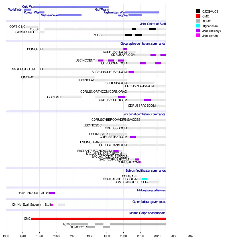 - ^ Positions listed are those held by the officer when promoted to general. Dates listed are for the officer's full tenure, which may predate promotion to four-star rank or postdate retirement from active duty.