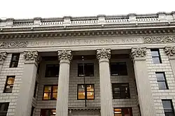 The United States National Bank Building in downtown Portland, Oregon was designed by A. E. Doyle in a Roman classical style,[3] and is listed on the National Register of Historic Places.[5] The four-story building's first section, facing Sixth Avenue, was completed and opened in 1917. The building features a four-story Corinthian colonnade at its eastern end (originally the principal façade) and makes extensive use of glazed terracotta. The interior is also decorated extensively with highly textured materials.