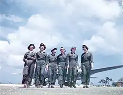 The first group of 24 Naval flight nurses graduated from the Navy Flight Nurse School at the Naval Air Station Alameda, California on 22 January 1945.[16] In addition to flight nurse procedures, they were trained to swim one mile, tow or push a victim for 220 yards, and swim 440 yards in 10 minutes.[17] The newly minted flight nurses soon began active flying service on 24 flying teams, consisting of a nurse and a pharmacist's mate. Each 12-plane squadron operated with the following medical personnel: 24 flight nurses, 24 pharmacists' mates, one flight surgeon, and one Hospital Corps officer. After a certain number of transcontinental trips with wounded servicemen, the teams were sent to the Pacific to serve in the Naval Air Evacuation Service, the first arriving in Guam in early February 1945.[18] There were three main flights of air evacuation planes to which flight nurses were assigned. First, from target areas to forward hospitals, such as Guam: second, from those forward hospitals to Pearl Harbor; and third, from Pearl Harbor to the contiguous United States. Nurses were rotated so that flight hours did not exceed 100 per month and they were also rotated between combat and noncombat flights.[18]