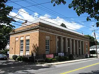 Palmer's main post office is located on the eastern outskirts of its downtown area, at the southeast corner of Park and Central Streets. It is a roughly rectangular single-story structure, with a steel frame and an exterior finished in brick and limestone. Its main entrance is centered on the long, street-facing side of the building, which is lined with large Ionic columns set in antis in a broad recess. The columns support a brick and limestone frieze, cornice, and low balustrade that encircles the truncated hip roof. The steps leading to the entrance are flanked by original Art Deco lampposts. The interior lobby area has terrazzo marble flooring and marble wainscoting, as well as original woodwork.[2][3]