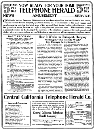- ^ "New Invention Enables One to Hear News, Concerts, Lectures and Sermons at Home", San Francisco Call, September 10, 1911, page 19.