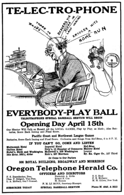 A January 1913 solicitation for home subscribers for "The Talking Newspaper and Amusement Purveyor" listed the hours of operation as 8:00 AM to midnight.[22] Later advertisements referred to the service as the "Te-Lec-Tro-Phone", and in April saw the introduction of the reporting of local Portland Beavers baseball games.[23] (In December, a Northwestern League representative complained that the service had hurt attendance, and supported "the ousting of the various telephone herald and signalling systems from the ball parks"). A promotion the following month offered the chance to hear election results for free at twenty-five business sites.[24] In May, the Portland Hotel advertised that diners could listen to "the latest baseball, business and other news by Telephone-Herald" with their meals.[25]