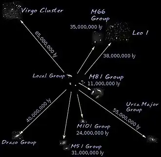 Matter, dark matter, and dark energy are distributed homogeneously throughout the universe over length scales longer than 300 million light-years (ly) or so.[93] However, over shorter length-scales, matter tends to clump hierarchically; many atoms are condensed into stars, most stars into galaxies, most galaxies into clusters, superclusters and, finally, large-scale galactic filaments. The observable universe contains as many as an estimated 2 trillion galaxies[94][95][96] and, overall, as many as an estimated 1024 stars[97][98] – more stars (and earth-like planets) than all the grains of beach sand on planet Earth;[99][100][101] but less than the total number of atoms estimated in the universe as 1082;[102] and the estimated total number of stars in an inflationary universe (observed and unobserved), as 10100.[103] Typical galaxies range from dwarfs with as few as ten million[104] (107) stars up to giants with one trillion[105] (1012) stars. Between the larger structures are voids, which are typically 10–150 Mpc (33 million–490 million ly) in diameter. The Milky Way is in the Local Group of galaxies, which in turn is in the Laniakea Supercluster.[106] This supercluster spans over 500 million light-years, while the Local Group spans over 10 million light-years.[107] The universe also has vast regions of relative emptiness; the largest known void measures 1.8 billion ly (550 Mpc) across.[108]