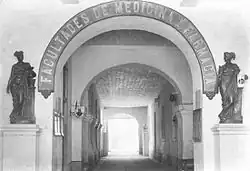 From 1871 until 1927, the Faculty of Medicine and Surgery conducted its classes in the Intramuros campus of the University of Santo Tomas. It was also associated with the San Juan de Dios Hospital which functioned as the faculty's clinical arm as decreed by King Alfonso of Spain on October 29, 1875.[3] This setup continued until 1941 when the Japanese took over Quezon Institute and transferring all of its medical staff and patients to San Juan de Dios Hospital. Clinical training during this time was in partnership with Saint Paul Hospital in Intramuros until the walled city's destruction during the Liberation of Manila.