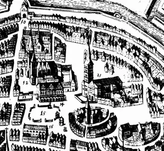 In the 16th century, there was still a fenced graveyard, but later on, almost the whole square was packed with graves. The churchyard and the flour of the church were the most important burial ground of Bremen. The first city hall of Bremen was situated at the south western edge of the Square, facing Obernstraße (High Street) to the south and Sögestraße (Pig Street) to the west.[1] At this time the square also served as a marketplace, together with the Bremer Market, which was levelled and paved already in the thirteenth century.[2] Liebfrauenkirche was specified as market church. In the seventeenth century the Old Börse stood on the north side of Obernstraße (which was mentioned already in the 13th century as Platea Superior ("Upper Paved Street"); the construction was interrupted in the Thirty Years' War, the basement could already be used as a wine cellar, the top side was provisionally paved with fine ashlar that had been bought for the building and was used as a ground for lazy walking ("spazierplatz"). In 1687, a one-story building was erected above the wine cellar in Baroque style,[3] following plans of the Council's architect Jean Baptiste Broebes, who had fled from Paris. A second floor was added between 1734 and 1736 by the plans of Giselher von Warneck.