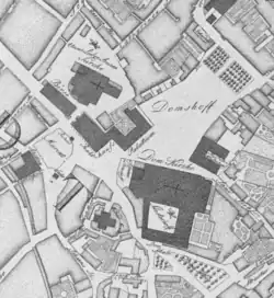 Left of the middle foreground, the Marktplatz, behind it the Bremen City Hall and to the left the (Old) Börse, behind both, the Unser Lieben Frauen Kirche with Kirchhof. Right of this, the Bishop's Palace projects into the (Main) Domshof. At the right corner of this the Dom and in front of its west facade is the fenced Little Domshof, in front of the now demolished Wilhadikapelle. In front of the Dom to the right is the Domsheide.
