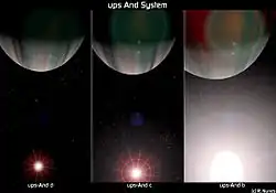 - ^ a b c Pizkorz, D.; et al. (August 2017). "Detection of Water Vapor in the Thermal Spectrum of the Non-transiting Hot Jupiter Upsilon Andromedae b". The Astronomical Journal. 154 (2): 78. arXiv:1707.01534. Bibcode:2017AJ....154...78P. doi:10.3847/1538-3881/aa7dd8. S2CID 19960378.