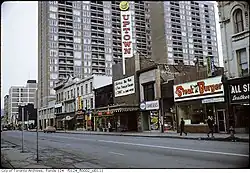 The Uptown Theatre was a historic movie theatre in Toronto, Ontario which was demolished in 2003. The entrance to the theatre was located on Yonge Street just south of Bloor. Like many theatres of the time (including the Elgin & Winter Garden Theatre) it was constructed so that only the entrance was on a major thoroughfare while the main building fronted on a side street. A bridge connected the two buildings.