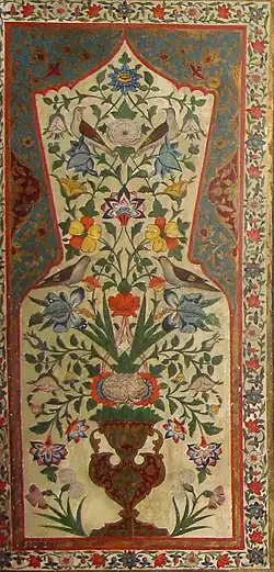 Later works of Karabakhi, saving a mastery of ancient decorative paintings, are distinguished for growth of realistic features in interpretation of distinct graphic motifs. A picture drawn by him in the house of Mehmandarov in Shusha city, where images of deer and pomegranate tree are distinguished for their free interpretation and sappiness of forms, is the most famous picture of the artist. The artist created on the basis of both earlier developed canonized schemes and immediate observations.[8]