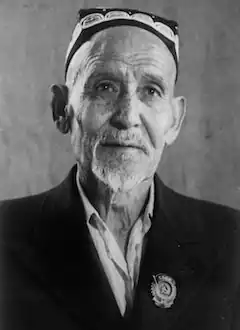 He became a People's Artist of the Uzbek SSR in 1937 and in 1932 he was awarded the title Hero of Labour, the predecessor to the title Hero of Socialist Labour.[9] On 31 May 1937 he was awarded the Order of the Red Banner of Labour.[10] In 1935, he was awarded a personal medal from the Queen of England for his musical performance at the International Folk Dance Festival in London.[6] A streets in Tashkent and Margilon are named in his honor as well as a music school in Fergana.[4]