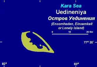 Uyedineniya Island (also Uedinenia, Russian: Остров Уединения; Norwegian: Ensomheden) is an island located in the central part of the Kara Sea, roughly midway between Novaya Zemlya and Severnaya Zemlya. Its latitude is 77° 29' N and its longitude 82° 30' E. It is often labelled as Einsamkeit Island (from the German Insel der Einsamkeit) as well as Lonely Island or Solitude Island in English maps.[1] It is best known from Nordenskiold's more famous works under the title of Ensamheten.[2]