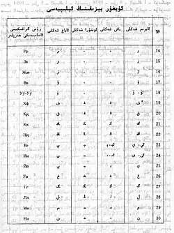 The Uyghur Cyrillic alphabet (Cyrillic script: Уйғур Кирил Йезиқи, Arabic script: ئۇيغۇر كىرىل يېزىقى, Latin script: Uyghur Kiril Yëziqi) is a Cyrillic-derived alphabet used for writing the Uyghur language, primarily by Uyghurs living in countries of the former Soviet Union. It is used to write Standard Soviet Uyghur.[1] It was created around 1937 by the Government of the Soviet Union, which wanted an alternative to the Latin-derived alphabet it had devised some eleven years earlier, in 1926. The Soviets dropped their Latin script for Uyghur because they feared its local use would encourage Soviet Uyghurs to seek closer ties with Turkey, which had switched to a Latin-based alphabet in 1927–1928.[1]