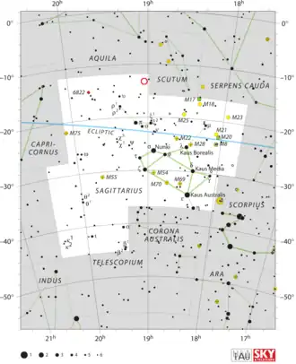 V1059 Sagittarii (also called Nova Sagittarii 1898) was a nova, which lit up in 1898[4] in the constellation Sagittarius. The star reached apparent magnitude 4.5, making it easily visible to the naked eye. It was discovered on 8 March 1898, by Williamina Fleming on a photographic plate taken at the Harvard College Observatory.[5] The discovery plate was an objective prism plate, part of the Henry Draper Memorial Photographs,[6] and Ms Fleming identified it as a nova based on its spectral characteristics.[7]