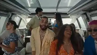 A screenshot from the music video, which shows Yatra, Turizo and Beéle at a party inside the ship.