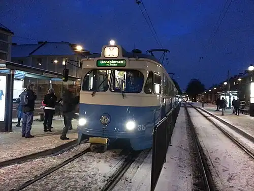 ![]() Tram stop at night with an M29 tram bound for Linneplatsen on line X | |||||