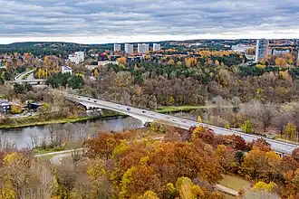 Valakampiai Bridge (Lithuanian: Valakampių tiltas) also known as Valakupiai Bridge (Lithuanian: Valakupių tiltas) is a bridge across Neris River, that connects Žirmūnai and Antakalnis districts of Vilnius. Built in 1972.[1] As of 2007, it is the longest bridge in Vilnius, 341.5 metres long and approximately 21.0 metres wide.[2] The bridge has six spans: the major one, 100.0 metres long is over the river, the second one is on the left bank and four-span viaduct is on the right bank. It is made of ferroconcrete blocks, connected by wire fibers into inseparable ferroconcrete beams.