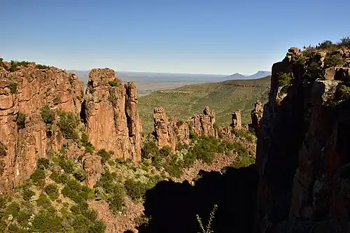 Perpendicular cliffs and high dolorite pillars against the backdrop of the plains of the Kamdeboo are the result of volcanic activity and erosion 150 to 190 million years ago.[4][2]