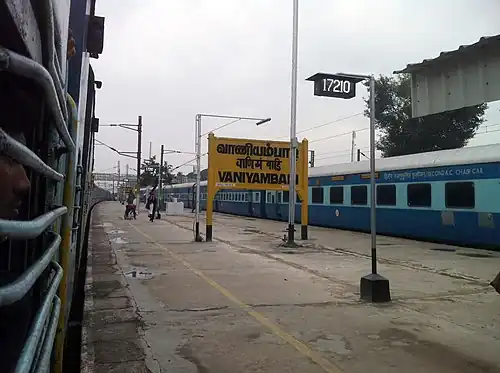 Vaniyambadi railway station (station code: VN) is an NSG–5 category Indian railway station in Chennai railway division of Southern Railway zone.[1] It is a railway station in the town of Vaniyambadi, Tamil Nadu, India.