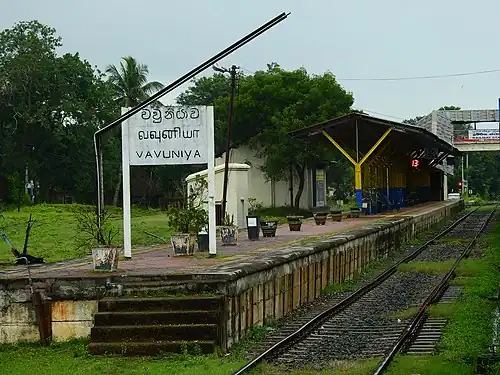 Vavuniya railway station (Tamil: வவுனியா தொடருந்து நிலையம் Vavuṉiyā toṭaruntu nilaiyam) is a railway station in the city of Vavuniya in northern Sri Lanka. Owned by Sri Lanka Railways, the state-owned railway operator, the station is part of the Northern Line which links the north with the capital Colombo. The popular Yarl Devi service calls at the station and the also popular service Rajarata Rejini terminates at the station, which starts at Matara in down south. No services operated north of Vavuniya after 1990 due to the civil war.[1] Reconstruction of this section of the line commenced following the end of the civil war in 2009. Currently services operate up to KKS.[2]