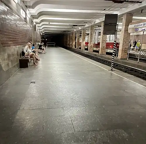Vechirnii Bulvar (lit.'Evening Boulevard', Ukrainian: Вечірній бульвар) is a station on the Kryvyi Rih Metrotram. Opened as part of the first stage on 26 December 1986, it was the first proper Metro-type underground station in the system. Located in the middle of a tunnel stretch that is of 2.3 kilometers in length which was built to avoid physically dividing the Microdistrict 6 by the Metro tracks, as the original 1970s designs called for.