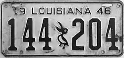 1946 | Embossed black serial with pelican separator on white plate with border line; "19 LOUISIANA 46" at top | none | 123-456 | 1-001 to approximately 337-000 | |