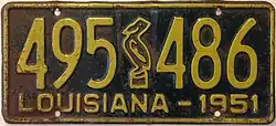 1951 | Embossed yellow serial with pelican separator on dark green plate with border line; "LOUISIANA–1951" at bottom | none | 123-456 | 1-001 to approximately 566-000 | |