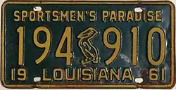 1961 | Embossed golden yellow serial with pelican separator on dark green plate with border line; "19 LOUISIANA 61" at bottom | "SPORTSMEN'S PARADISE" at top | 123-456 | 1-001 to approximately 948-000 | |