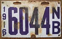1916 | Dark blue serial on light blue porcelain plate; vertical "1916" and "NB" at left and right respectively | none | 1234 | 3000 to approximately 6500 | |