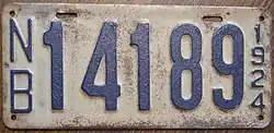 1924 | Embossed dark blue serial on grey plate; vertical "NB" and "1924" at left and right respectively | none | 12345 | 1000 to approximately 20900 | |