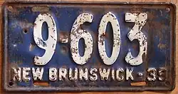 1936 | Embossed black serial on white plate; "NEW BRUNSWICK-36" at bottom | none | A-1234 | Coded by region (A) | |