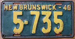 1940 | Embossed yellow serial on dark green plate; "NEW BRUNSWICK - 40" at top | none | 12-345 | 2-000 to approximately 36-500 | |