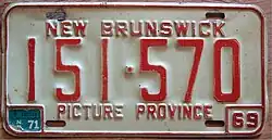 1969–71 | Embossed red serial on reflective white plate; border lines around plate and around bottom corners; "NEW BRUNSWICK" centred at top; "69" at bottom right | "PICTURE PROVINCE" centred at bottom | 123-456 | 1-000 to approximately 239-000 | |