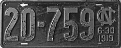 1918–19 | Embossed white serial on black plate; "NC" monogram and "6-30 1919" at right | none | 12-345 | 1 to approximately 80-000 | |