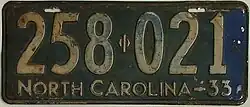 1933 | Embossed white serial on dark blue plate; "NORTH CAROLINA–33" at bottom | none | 123-456 | 100-001 to approximately 464-000 | |