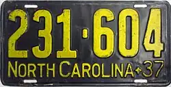 | 1937 | Embossed yellow serial on black plate; "NORTH CAROLINA–37" at bottom | none | 123-456 | 200-001 to approximately 651-000 | Serials 100-001 through 200-000 reserved for trucks; this practice continued through 1946.[4] | |